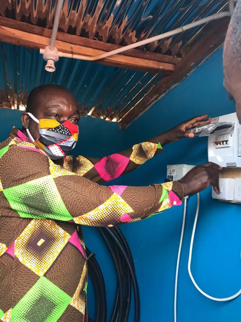 The borehole at Nyinampong has just been mechanised, so now people can turn on a tap and have the water pour straight into a bucket for carrying home.