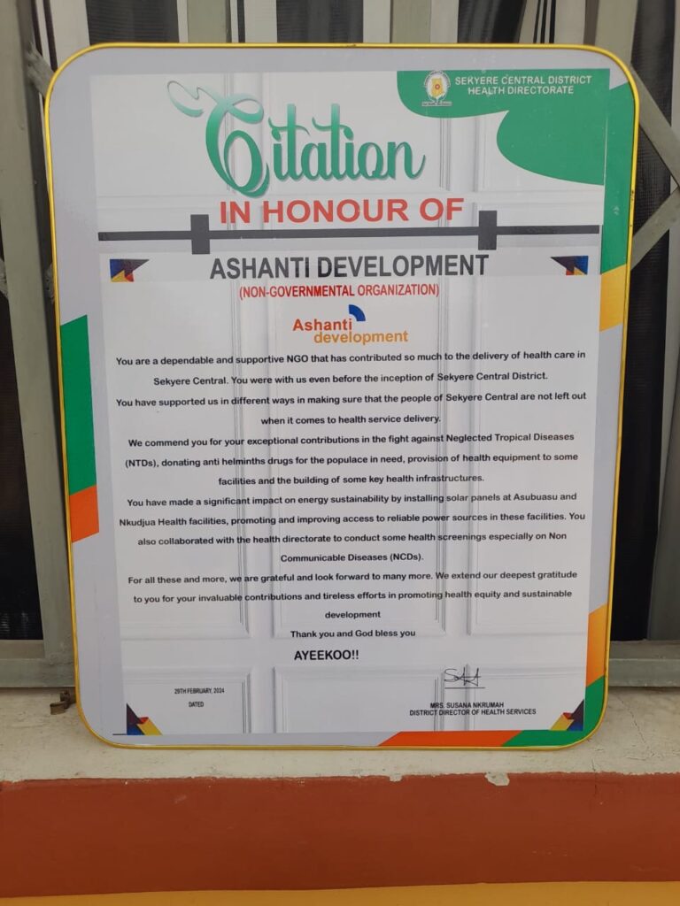 The Sekyere Central District Health Directorate has honoured Ashanti Development with a Citation. Received by Nicholas Aboagye, our Ghana Director for Ashanti Development.